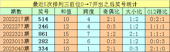 1、排列三最近两期百位号码分别开出0和7,历史上百位号码连续两期分别开出0和7的奖号出现了65期。前五期开出之后其下期奖号分别为:514、246、861、282、334;
