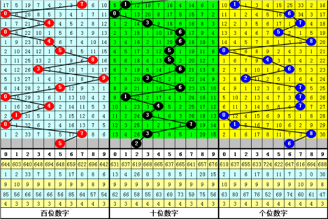 3、在以上0-9号码频次中,号码大小比为31:33,012路比为24:19:21,本期预计百位开出2路号码,参考号码5。
