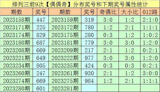 在最近9期开出奇偶分布:偶偶奇的奖号为:447-225-829-687-669-649-805-247-669,在下期出现号码分别为:319-780-280-779-217-977-424-930-984。其中百十个位号码分布情况如下: