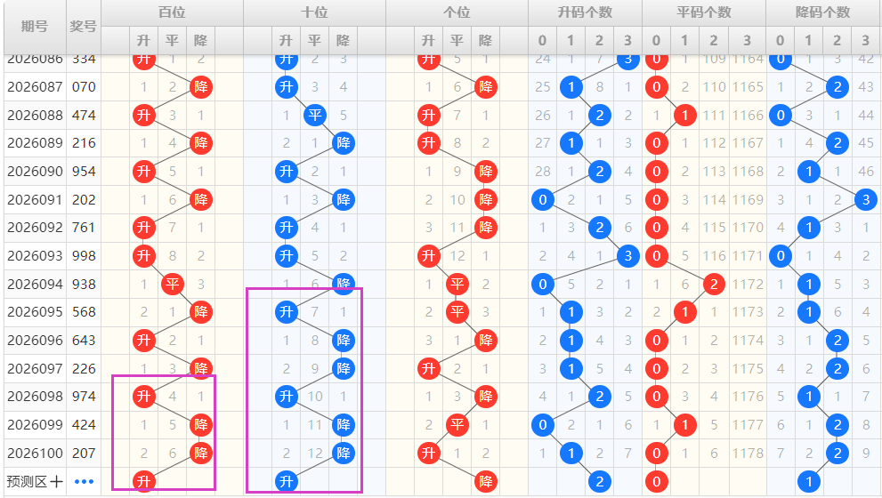 【排列3个位】:近期升降走势为:降-降-降-升-平-平-降-升-降-平-升,为一种交错走势,结合走势图可以看出,图中紫色框圈出为一种M形态的出球方式,本期可以重点看好升的形态号码的开出。