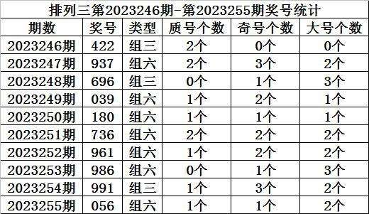 上期回顾:排列三第2023255期开奖:056,质合比为1:2,奇偶比为2:1,大小比为1:2。