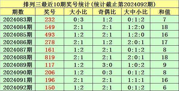 上期回顾:排列三第2024092期奖号为:150。奖号类型:组六,和值:6,奇偶比:2:1,跨度:5,大小比:1:2。