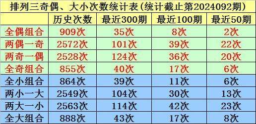 大小、奇偶分析:在连续40期奖号中,全小出现6期,当前遗漏9期、两小一大出现11期,当前遗漏0期、两大一小出现18期,当前遗漏1期、全大出现5期,当前遗漏13期,本期看好开出全小;全偶有2次,目前遗漏2期、两偶一奇有22次,目前遗漏6期、两奇一偶有20次,目前遗漏0期、全奇有6次,目前遗漏3次,本期预计出现两偶一奇。