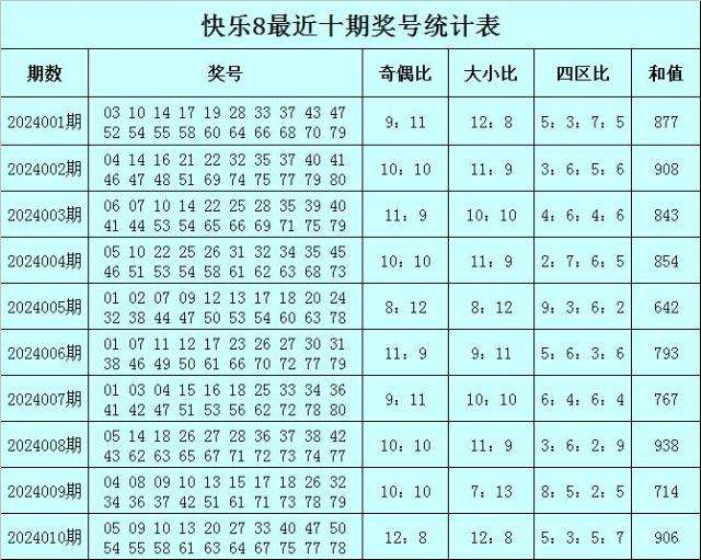 福彩快乐8第2024010期开奖回顾:05 09 10 13 20 27 33 40 47 50 54 55 58 61 63 64 67 75 77 78,其中奖号四区比为5:3:5:7,奇偶比比为12:8,大小比为12:8,和值为906。