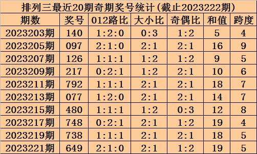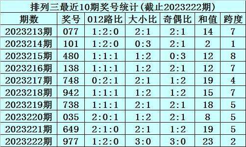 上期回顾:排列三2023222期奖号为977,奇偶比为3:0,大小比为3:0,跨度为23。