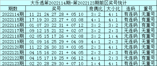 上期回顾:体彩大乐透第22123期奖号开出:02 20 28 29 30+07 10,前区奖号奇偶比为1:4,012路比为1:1:3,大小比为4:1,包含连码:28 29 30,没有开出重号。