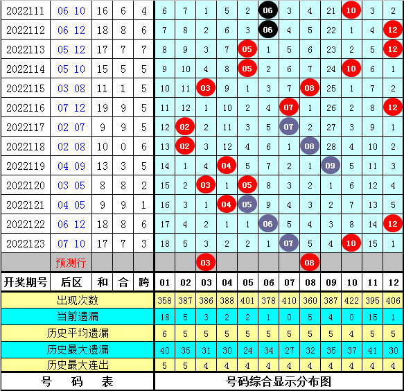 后区分析:上期后区奖号为07和10,最近10期后区各号码频次为:号码05、07出现3次,02、03、04、08、10、12出现2次,06、09出现1次,其中号码01、11没有出现,本期后区参考号码02、03、07、08、09、12,单注参考03+08。