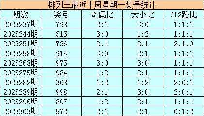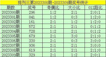 开奖回顾:排列三第2023309期奖号为:329,其奇偶比为2:1,大小比为1:2,奖号012路比为2:0:1。