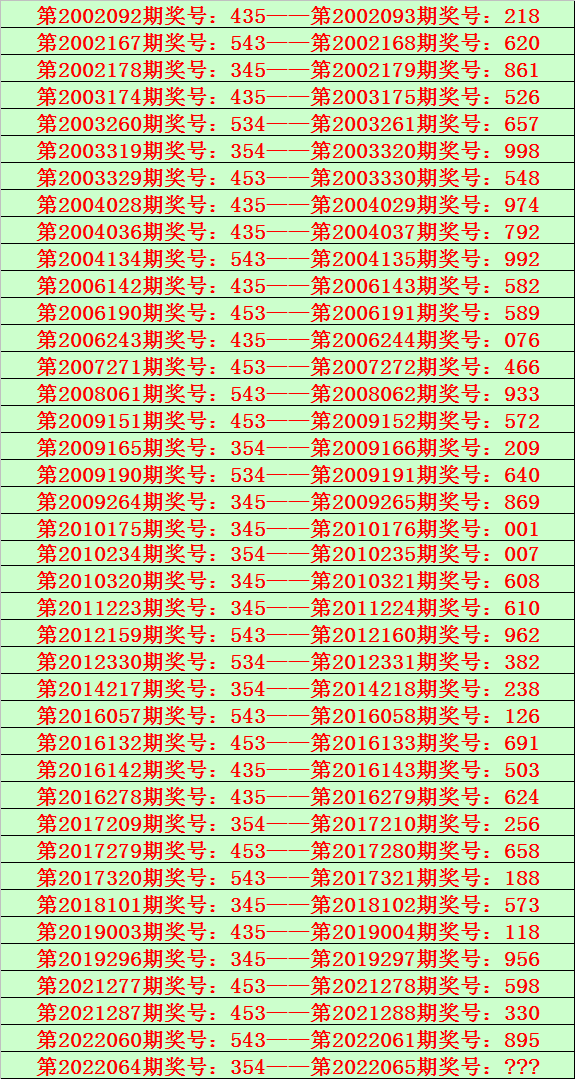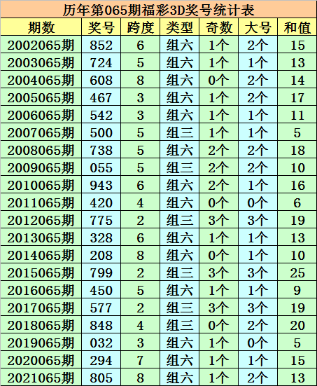 福彩3D第2022065期开奖日期:2022年3月16日,历史上第065期已开出了20次奖号,历年同期号码分别为:852、724、608、467、542、500、738、055、943、420、775、328、208、799、450、577、848、032、294、805。