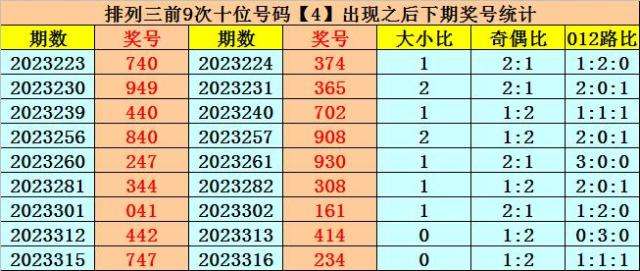 在十位前9次出现号码4后,其下期奖号分别开出:7-6-0-0-3-0-6-1-3,其中奖号个数大小比是3:6,012路比是7:2:0,奇偶比是4:5。
