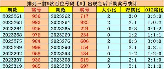百位号码:百位上期奖号为1路、奇数、大号:9,历史上百位号码9共开出675期,前一次开出期数在第2023319期,上期奖号隔3期再次开出。