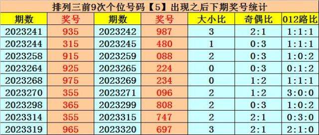 个位号码:上期奖号为大号、奇数、2路号码:5,历史上个位号码5共开出645期,前一次出现在第2023319期,上期遗漏3期再出。