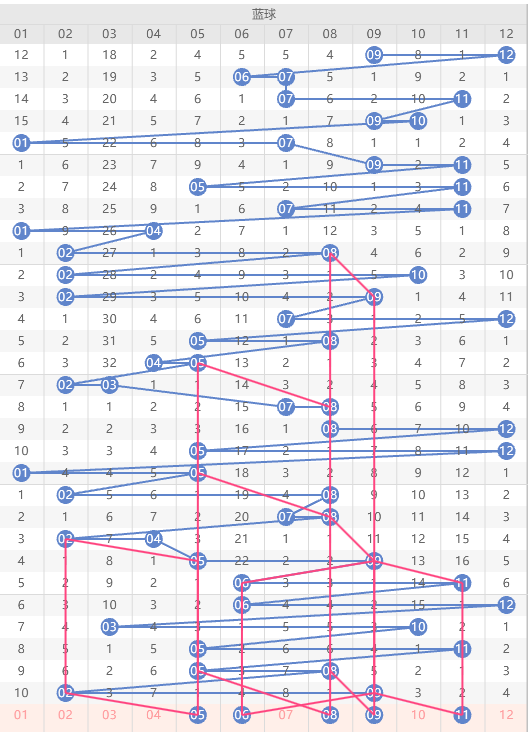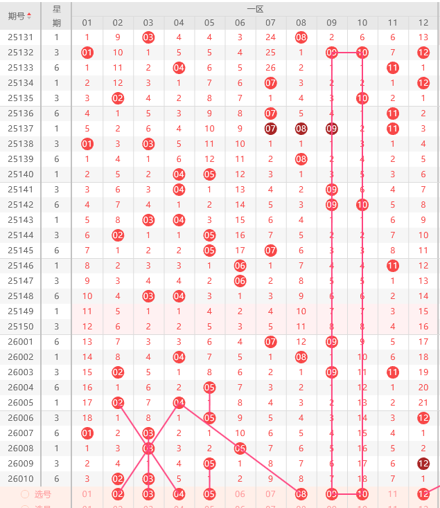 区间段号码分析:02为双重分边走势形态,03为同形态双重下落走势,04为分边隔二期斜三连走势,05为隔一期同形态回补走势,08为隔二期偶数斜三连走势,0910为对子下落回补走势,12为方向斜三连走势形态。