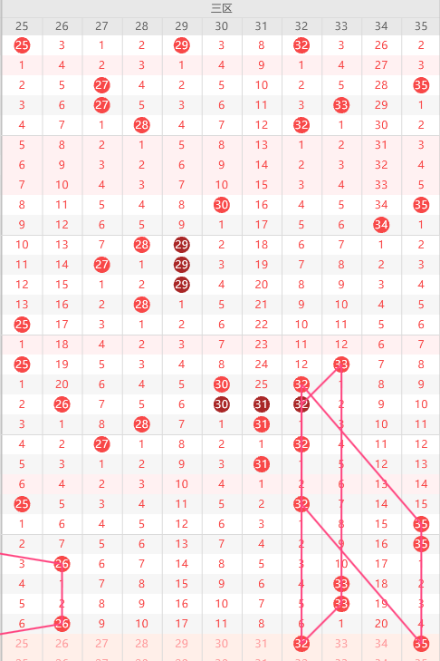 区间段号码分析:32为交替回补走势形态,35为同形态隔四期回补走势。
