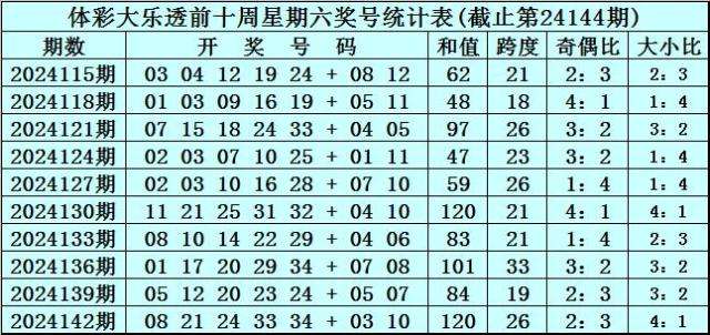 体彩大乐透上周星期六开出奖号为:08 21 24 33 34 + 03 10。前区奖号和值为120,跨度为26,奇偶比为2:3,大小比为4:1。后区奖号和值为13,跨度为7。