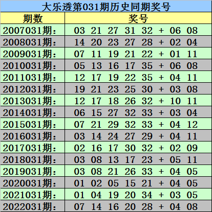 1、历史上大乐透第031期开出了16次,从2007年-2022年;