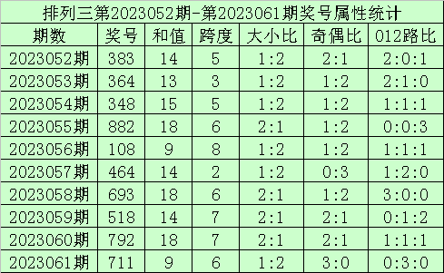 上期回顾:排列三第2023061期开奖号:711,奖号和值:9,奇偶比3:0,大小比1:2。