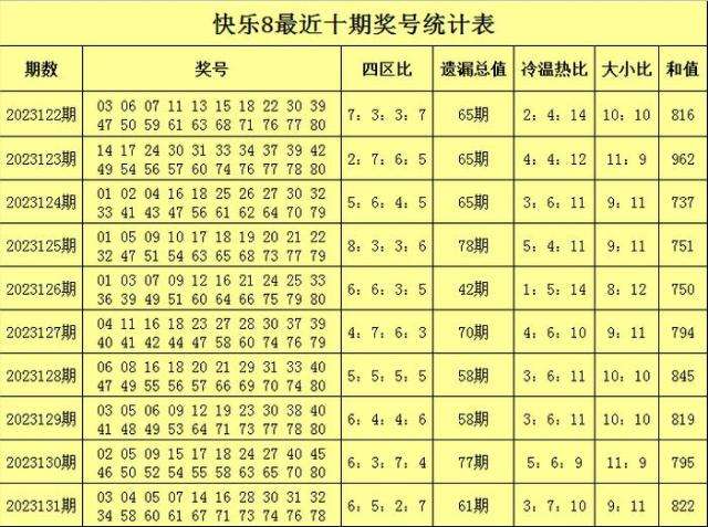 福彩快乐8第2023131期开奖回顾:03 04 05 07 14 16 28 30 31 32 34 58 60 61 67 71 73 74 76 78,其中奖号四区比为6:5:2:7,遗漏总值为61,大小比为9:11,012路比为4:11:5,和值为822。