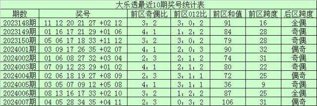 大乐透第2024007期开奖,前区:04、05、28、34、35;后区:04、11。其中前区和值为106,跨度为31,012路比为0:3:2,奇偶比为2:3,后区开出一偶一奇、1路+2路组合。