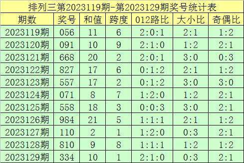 开奖回顾:排列三第2023129期奖号开出:334,组选类型:组三,大小比为0:3,奇偶比为2:1,和值为10,跨度为1。