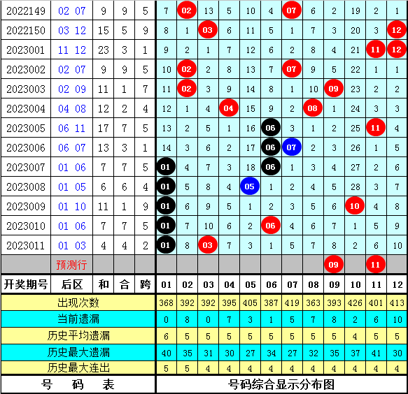 后区分析:后区上期开出号码01+03,和值为4,跨度为2。最近10区后一区(01-06)开出14个号码,断区0次,后二区(07-12)开出6个号码,断区4次,本期后一区注意号码:03、04、05、06;后二区注意号码:09、11。
