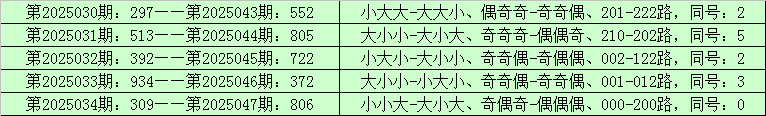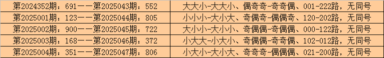所以,排列三第2025005期奖号:617,与排列三第2025048期奖号可能没有同号。且排列三第2025048期奖号大小比、奇偶比和012路比不会与第2025005期奖号直选形态:大小大、偶奇奇和011路全部相同。