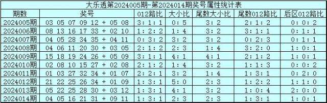 体彩大乐透第24014期奖号为:04 05 16 21 31+09 11,其中前区奖号012路比为1:3:1,大小比为2:3,奇偶比为3:2,包含同尾奖号:21 31。