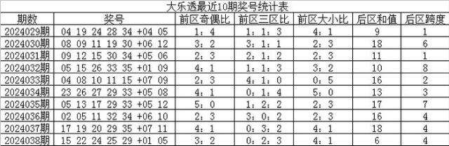 大乐透第2024038期开出奖号:15 22 24 25 29 + 01 05。其中前区号码三区比为0:2:3,奇偶比为3:2,大小比为4:1,后区开出全小、一奇一偶奖号。