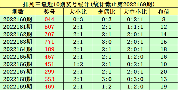 上期回顾:排列三第2022169期奖号为:469。奖号类型:组六,和值:19,奇偶比:1:2,跨度:5,大小比:2:1。