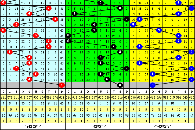 大中小分析:在组选0-9号码分布图中,前10期小号(0-2区段)出现7枚奖号,中号(3-6区段)出现12枚奖号,大号(7-9区段)出现11枚奖号,上期0小号区域断区,本期注意小号走冷,防0-2区段断区。