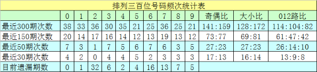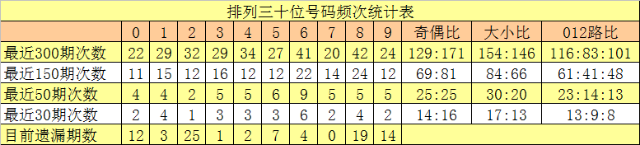 个位号码:前50期走势最活跃的号码为:8开出9个,1开出7个,4、7开出6个;走势最冷的号码为:3、6开出3个,0、2、5、9开出4个。个位号码大小比开出26:24,奇偶比开出24:26。本期个位排除两码:5、9,关注号码0、3、4,胆码参考3。