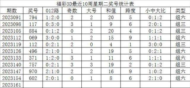 福彩3D最近10周星期二开出奖号分别为: