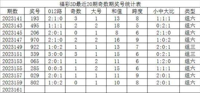 福彩3D最近20期奇数期奖号为: