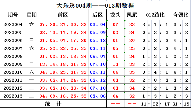 上期回顾,大乐透第2022013期开奖,本期奖号:前区04 09 16 25 32;后区05 06,当期前区号码大小比为2:3,三区比2:1:2,奇偶比为2:3。前区未开出连号,未开出重号。