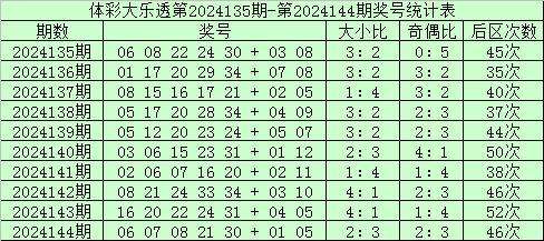 体彩大乐透第24144期开出奖号:06 07 08 21 30+01 05,其中前区奖号大小比为2:3,奇偶比为2:3,后区奖号01+05,在历史上开出了46次。
