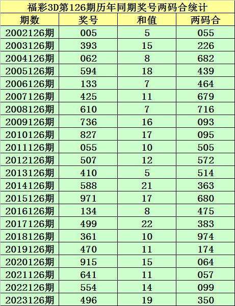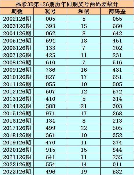 福彩3D第126期,历史上期开出22次奖号,其奖号分别为:005、393、062、594、133、425、610、736、827、055、507、410、588、971、134、499、361、470、915、641、554、496,奖号两码合差分别开出: