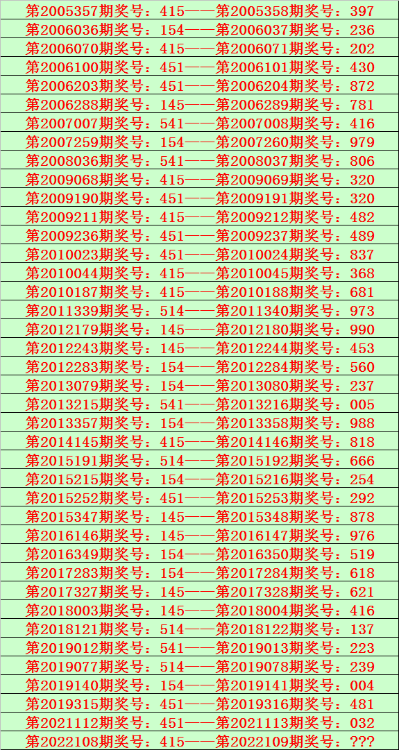 号码跨度:在第110期同期奖号中,跨度开出频次分别为:跨度6开出4期,跨度3、5、7开出3期,跨度2、4开出2期,跨度0、1、8、9没有出现。去年同期开出2,今年同期预计跨度上升,注意跨度3。