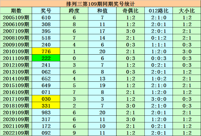 号码012路比:第110期历史同期号码012路比为15:23:13,本期预计012路比开出3:0:0。