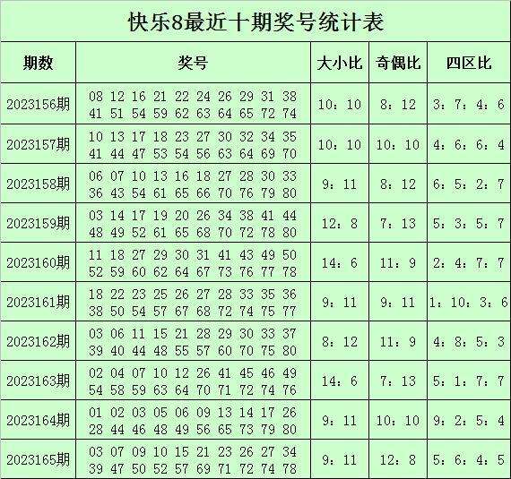 福彩快乐8第2023165期开奖回顾:03 07 09 10 15 21 23 26 27 34 39 47 50 52 57 69 71 72 74 78,其中奖号四区比为5:6:4:5,奇偶比为12:8,大小比为9:11。