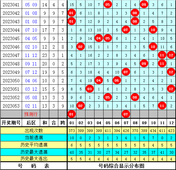 后区上期两码开出02和11,其号码遗漏值为6期+4期,本期后区重防冷码解冻,四码参考01、05、07、10,两码关注01和07。
