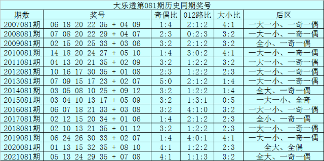 上期回顾:体彩大乐透第2022080期开奖号码为:10、17、30、31、34+03、06,其中前区奖号奇偶比为2:3,012路比为1:3:1,大小比为3:2,后区开出全小、一奇一偶组合。