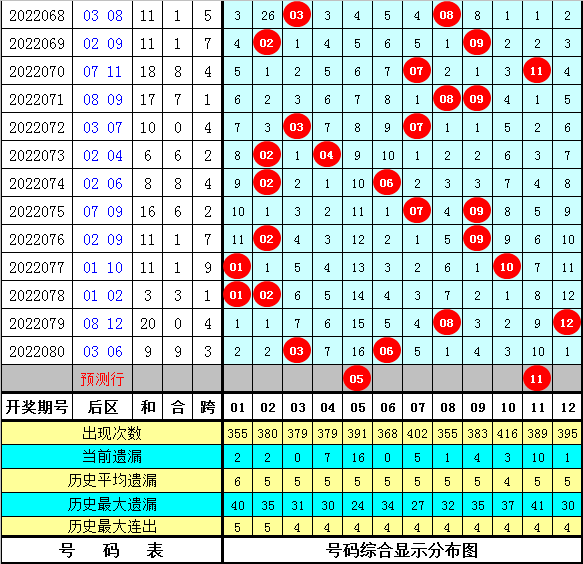 后区第二位分析:在历史第081期同期奖号中,后区第二位号码全部在06-12区段出现,其中该位号码012路比为7:5:3,奇偶比为6:9,大小比为13:2,本期第二位号码关注11。