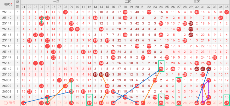 三区(25-35)分析:上期该区开出号码25 32,近10期占比32%,与上期相比+2%。本期无三斜连号趋势,隔码斜连走势:30。