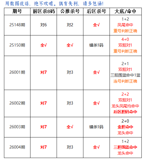 上期前区杀8码对7,公推前区杀4码对3,后区杀号全对。