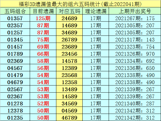 1。截止第22041期,五码组六遗漏最大的是:01357,当前遗漏125期。