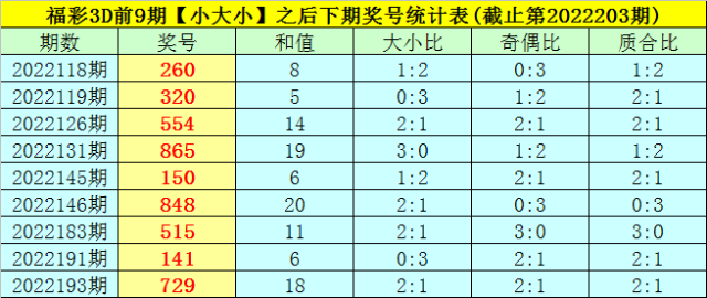 二、福彩3D上期开出奖号151,奖号大小比为1:2,大小类型开出【小大小】,该类型组合奖号在前9次分别开出号码:281-260-090-462-060-150-351-181-083;