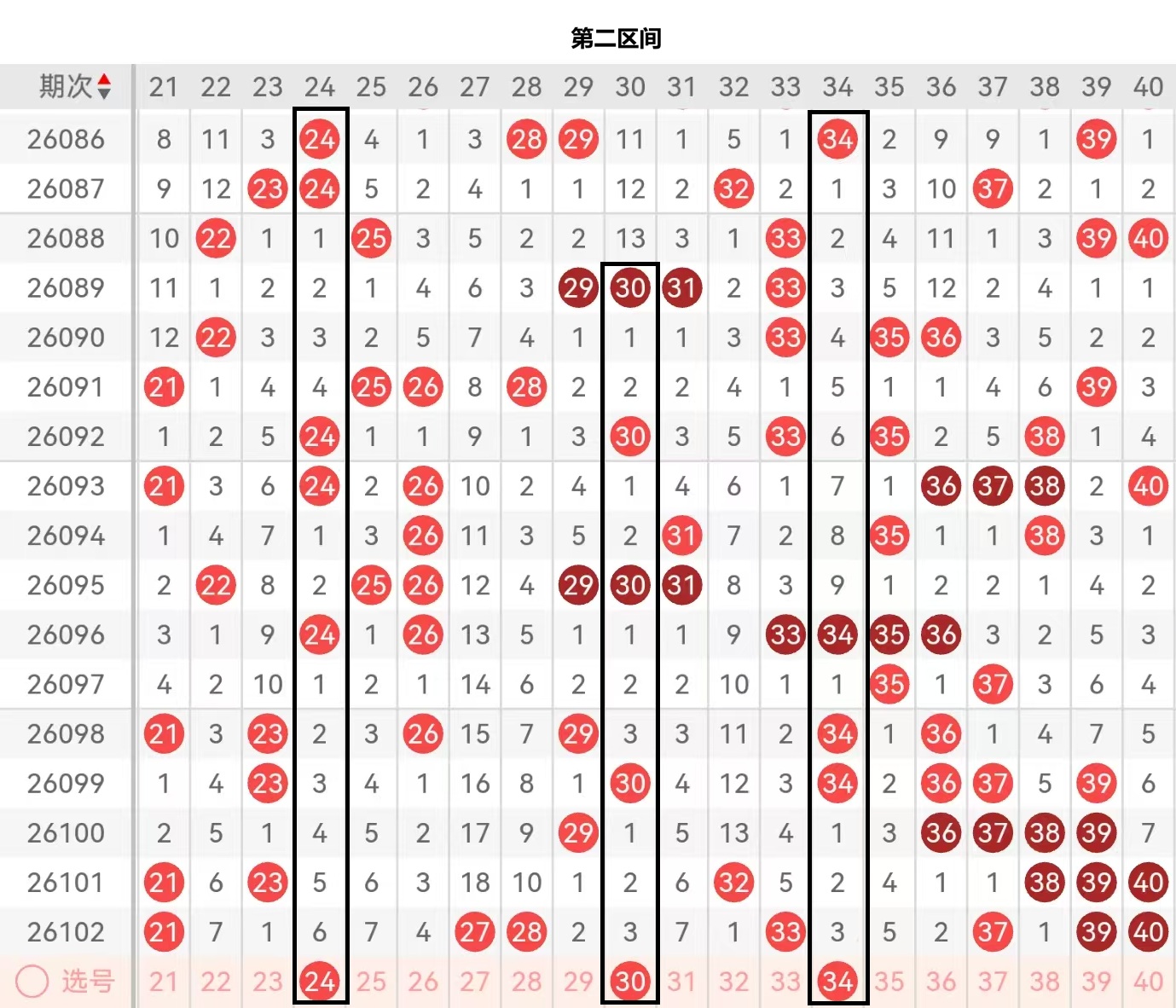 上期第二区间开出了(21 27 28 33 37 39 40)七个号码球,上期热态七码在二区间落位。区间号码走出热态七码落位。那么通过对上期二区间落位号码进行研判我们可以发现整个区间号码走出区域落位,区间前端开出21-27对应号码球,区间后端39-40姊妹对号码球开出。那么通过对二区间号码的落位趋势进行分析可以看到二区间的走势在本期落位后趋势向温态回调的可能性最大。那么本期我们在二区间进行操作时一定要加强对二区间形态号码球的研判,所以我们在二区间进行操作时一定要考虑区间热态号码更为合理。