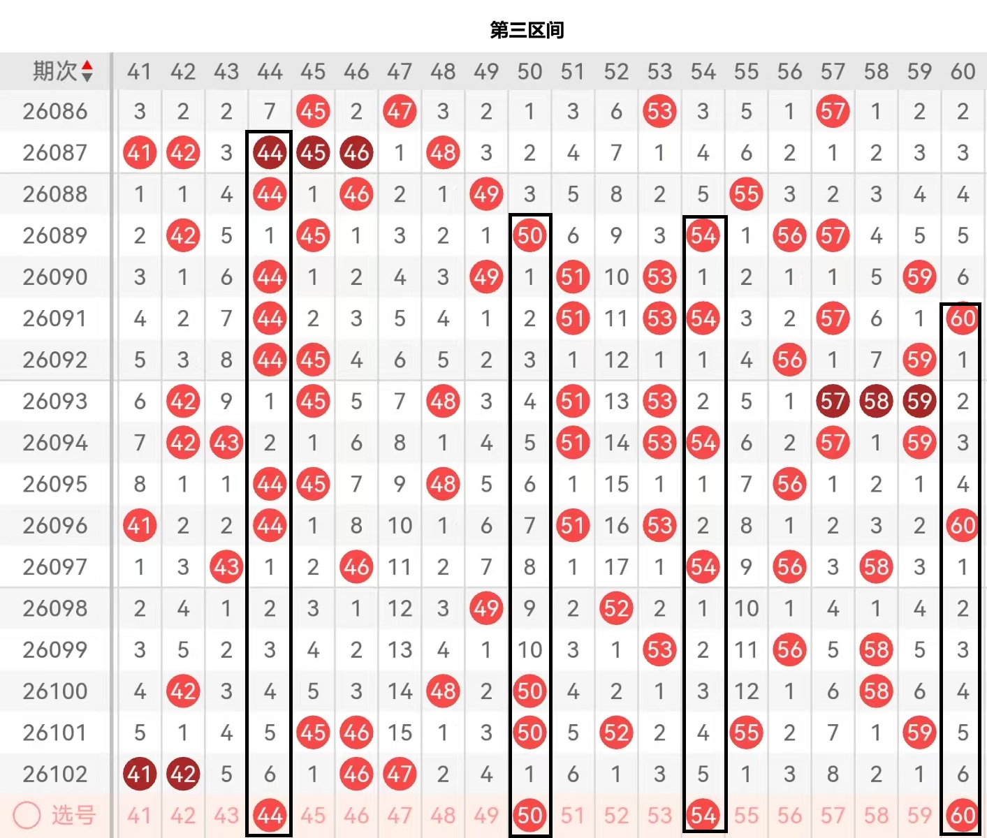 上期第三区间开出了(41 42 46 47)四个号码球,上期三区间开出温态四码落位,上期三区号码落位处于区间的前后端。区间前端41-42;46-47两组姊妹对号码球开出,那么通过对三区间的整体分析来看我认为接下来三区间号码在区间走出震荡后形成下行落号。那么大家一定要注意区间号码的冷调整趋势,区间后端断区开出,通过对三区间近期号码的分析来看号码走出温态调整的可能性最大。那么通过分析来看三区间在近期会继续出现走势分化的趋势,因此我们在对三区间进行分析后得出,未来我们要重点考虑近期回补号码球更为妥当。