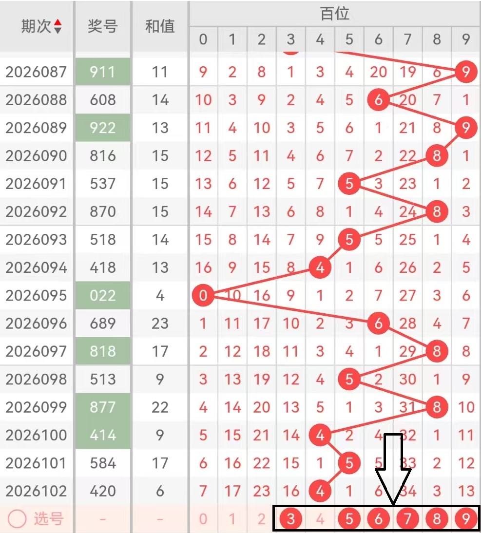 上期百位落位“4”走出偶数号码球,号码上期走出1个小振幅数值号码,落位走出“合数”号码球;五行走出“火”形态号码。那么通过对百位号码走势来分析,上期百位落位号码走出1个小振幅数值落位,那么本期我们通过对百位号码进行研判时需要考虑百位号码的走势号码本期可能走出中小振幅号码(012345)的可能性最大,在百位走出4号球之后,那么本期我们在百位要考虑中大数值号码(356789)的回补最为合理。本期通过对百位号码落位走势落位分析来看,本期我们在百位应该考虑区间中大号码回补更为合理。