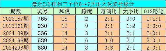 1、排列三前两期个位分别开出号码8和7,历史上个位号码连续两期分别出现8和7时,共有66次。在最近5次出现时,其下期分别出现号码:765、930、536、539、680;